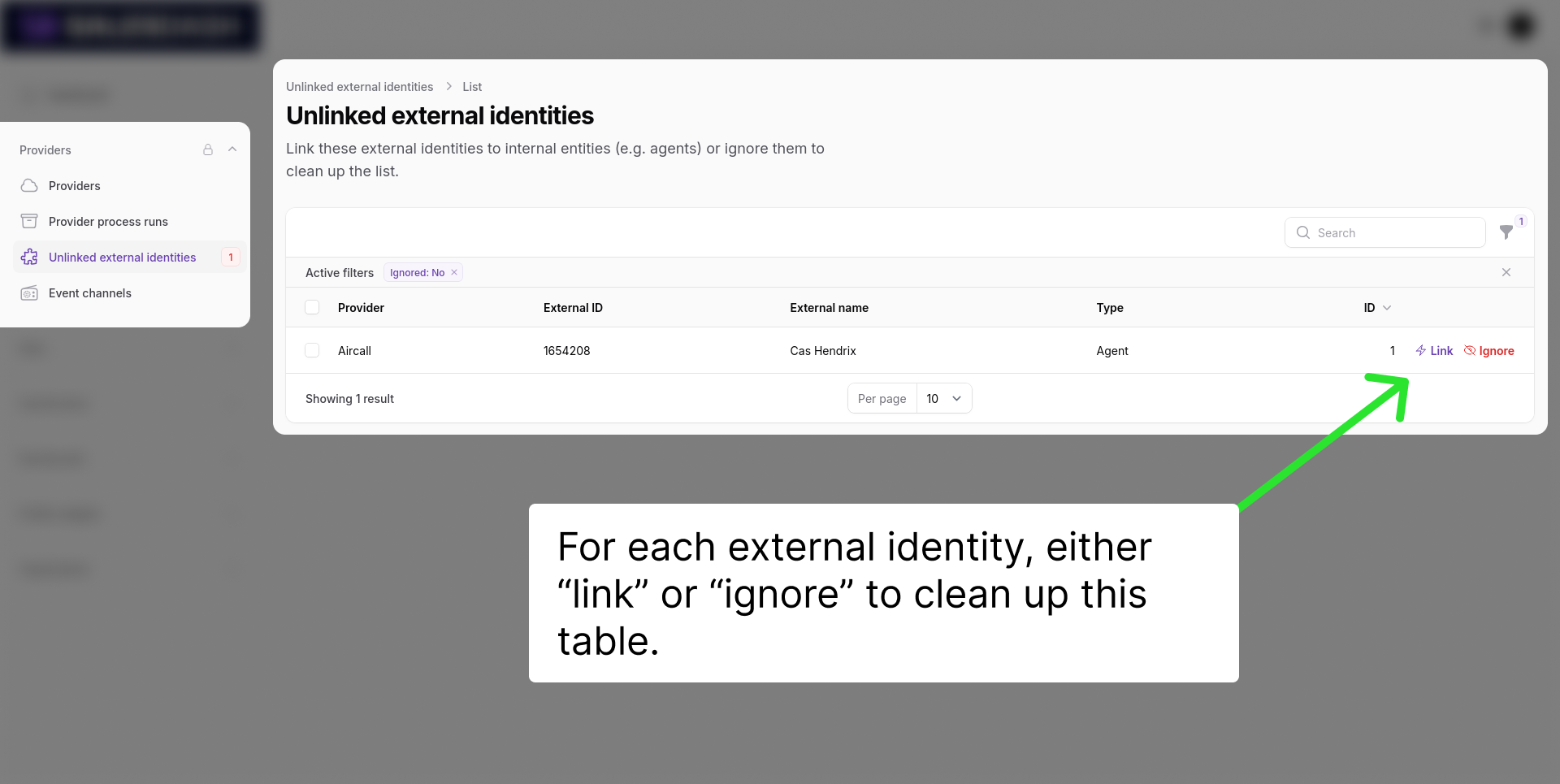 Hier zie je een overzicht van alle ongekoppelde externe identiteiten. Je kunt ze filteren op provider of type, zoeken, of het "genegeerd" filter uitschakelen om eerder genegeerde externe identiteiten te vinden.