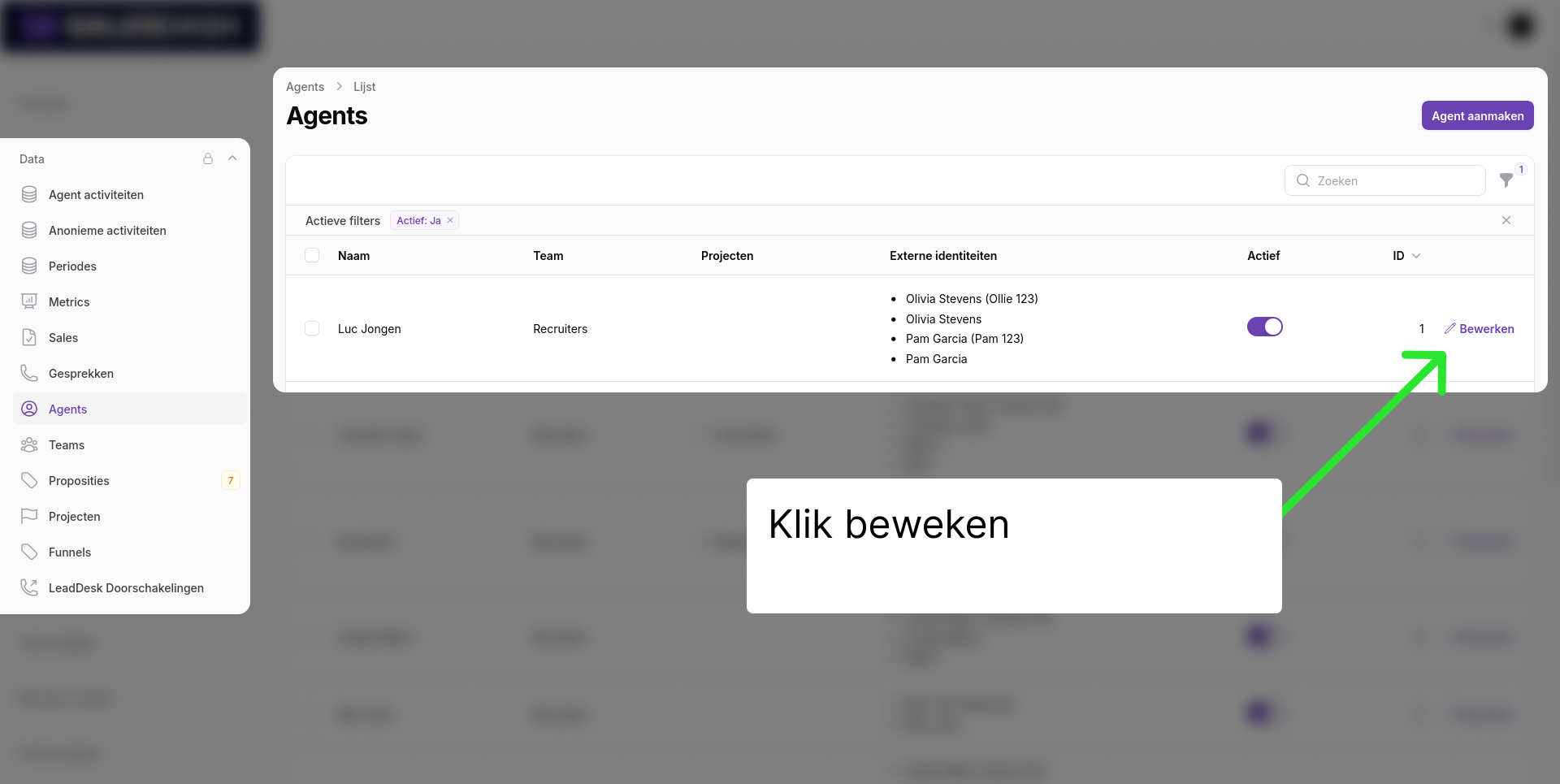 Je kunt een doelstelling van een van je teamleden veranderen via Data > Agents.