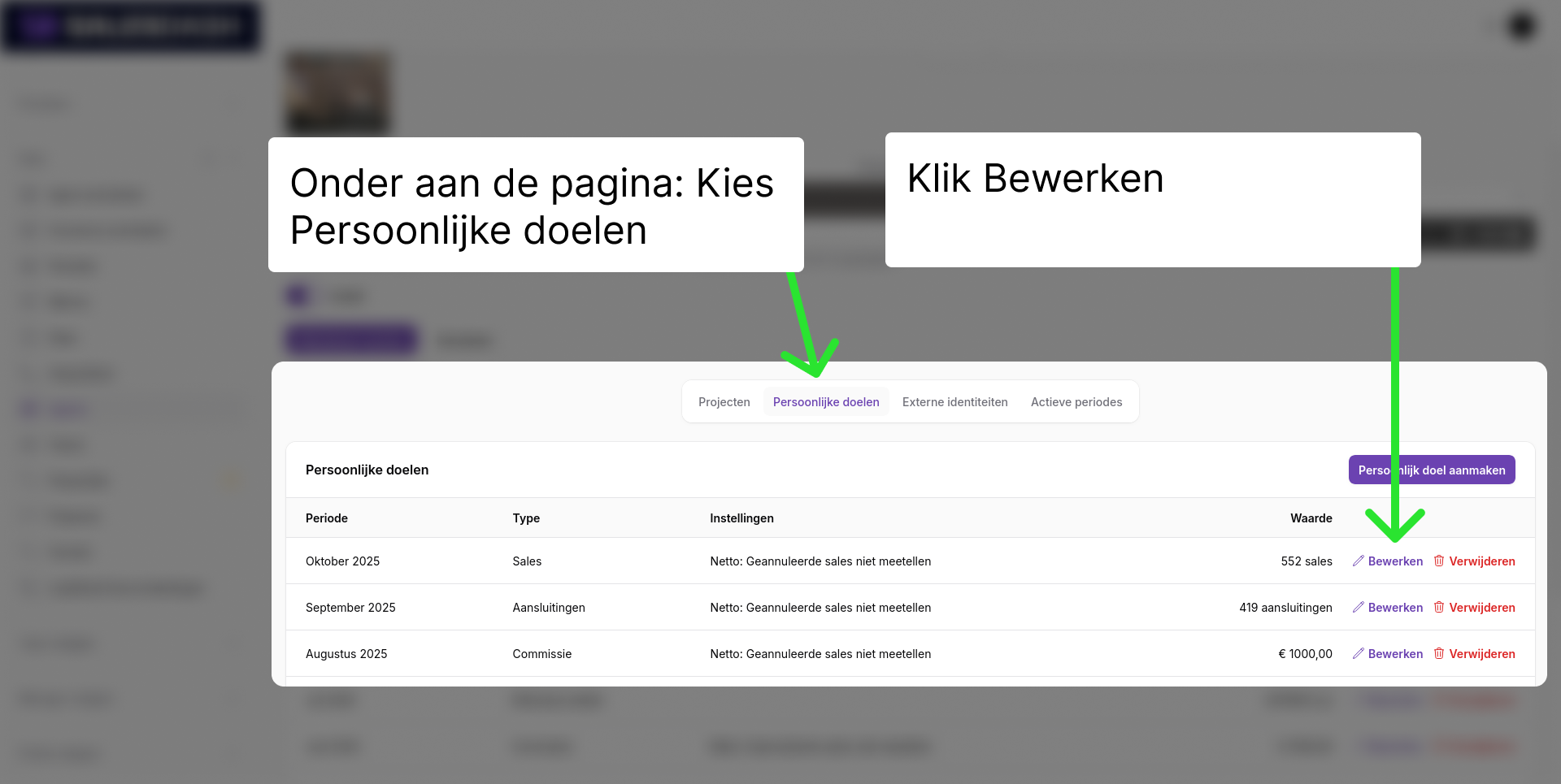Scroll naar onder en kies het horizontale menuitem Persoonlijke doelen. Zoek de juiste doelstelling en klik Bewerken.