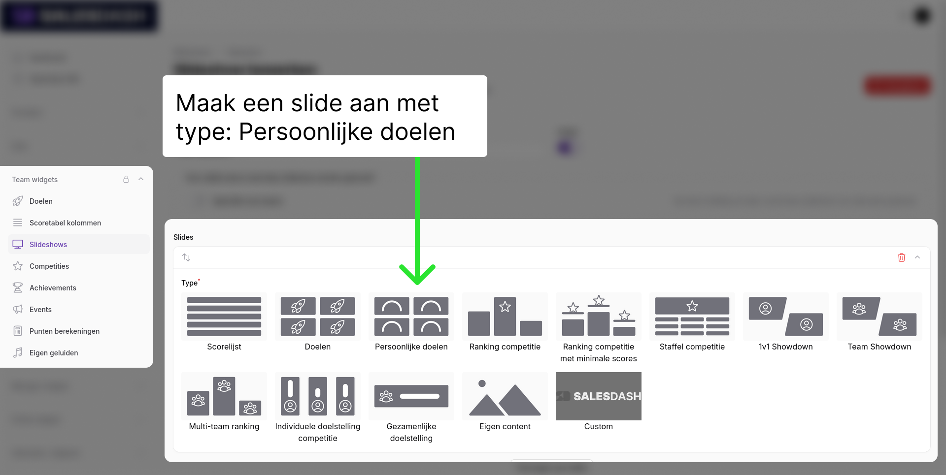 Voeg een slide toe met type 'Persoonlijke doelen'. Kies een van de designs en selecteer maand of week doelstellingen. Je kunt hier ook selecteren welke teamleden meegenomen moeten worden. Meestal kun je hier gewoon 'Alle agents' kiezen.