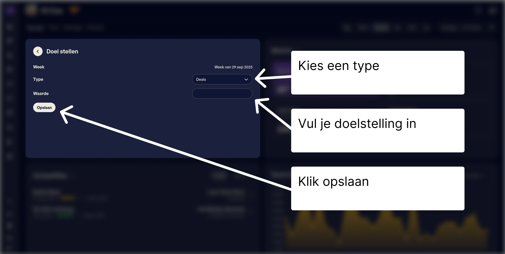In SalesDash kun je persoonlijke doelstellingen instellen. Je kunt voor iedere maand en iedere week één doelstelling maken, voor één metric dus.